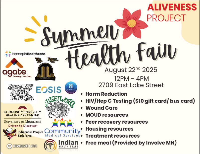 Join us at the Aliveness Summer Health Fair on Friday, August 22 from 12pm - 4pm located at 2709 East Lake St. MPLS
